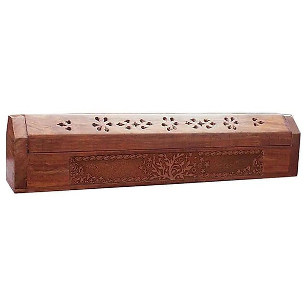 Reich verzierte gravierte Dekoration Baum des Lebens. Geeignet zum Abbrennen von Räucherstäbchen und Räucherkegeln. Mit Aufbewahrungsfach für Räucherstäbchen.